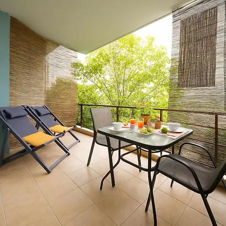The property overlooks the patio and comprises an adjoining terrace and a living room with climate control and a washing machine. The apartment features a bathroom with a hairdryer and bath sheets.